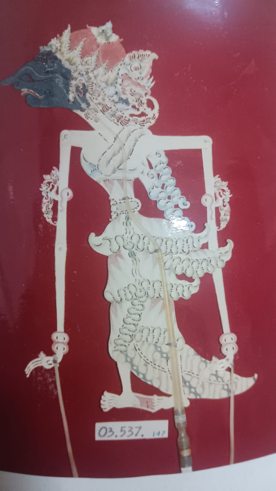 Benda ini terbuat dari bahan dasar kulit, berwarna merah, hijau, putih, biru, rambut digelung,-memakai kuluk, hidung mancung, wajah hitam, memakai dodot, jarik-lereng.