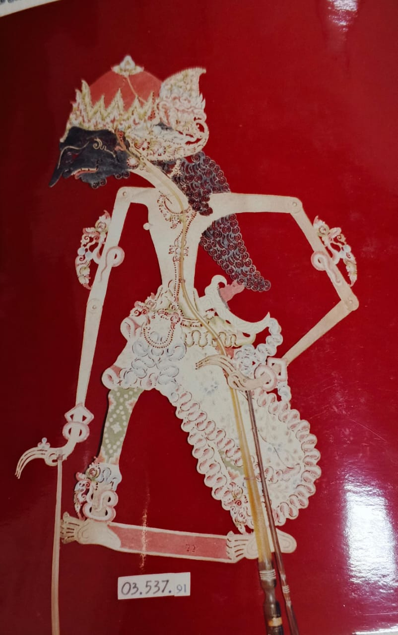 Benda ini terbuat dari kulit penyu. Berwarna coklat, merah, hijau, kuning, hitam. Berambut panjang, memakai kuluk, hidung panjang, muka hitam, celana panjang dan bersenjata keris.