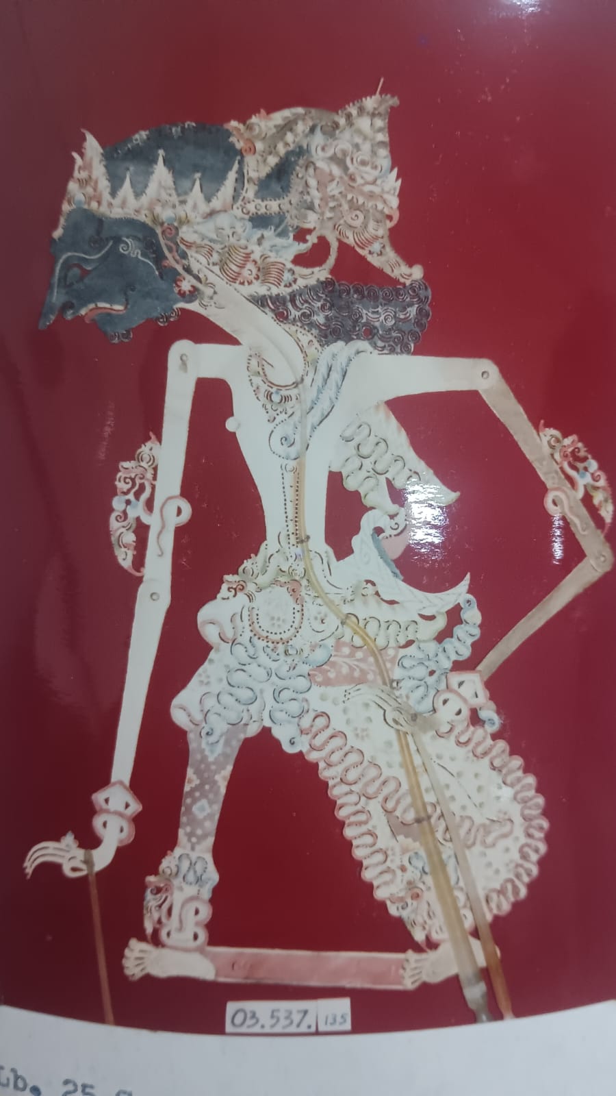 Benda ini terbuat dari bahan dasar kulit , berwarna coklat, merah, putih,biru, hijau. Rambut digelung hidung mancung, wajah hitam, celana panjang, bersenjata keris