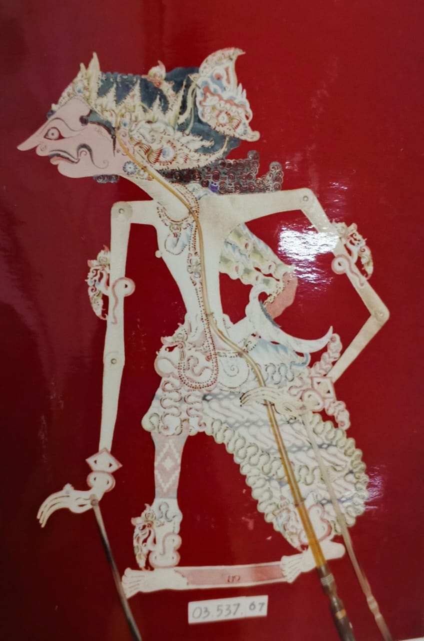 Benda ini terbuat dari kulit penyu, berwarna coklat, merah, kuning, hijau, biru. Rambut panjang, hidung mancung, bercelana panjang, jarit lereng dan bersenjata keris.