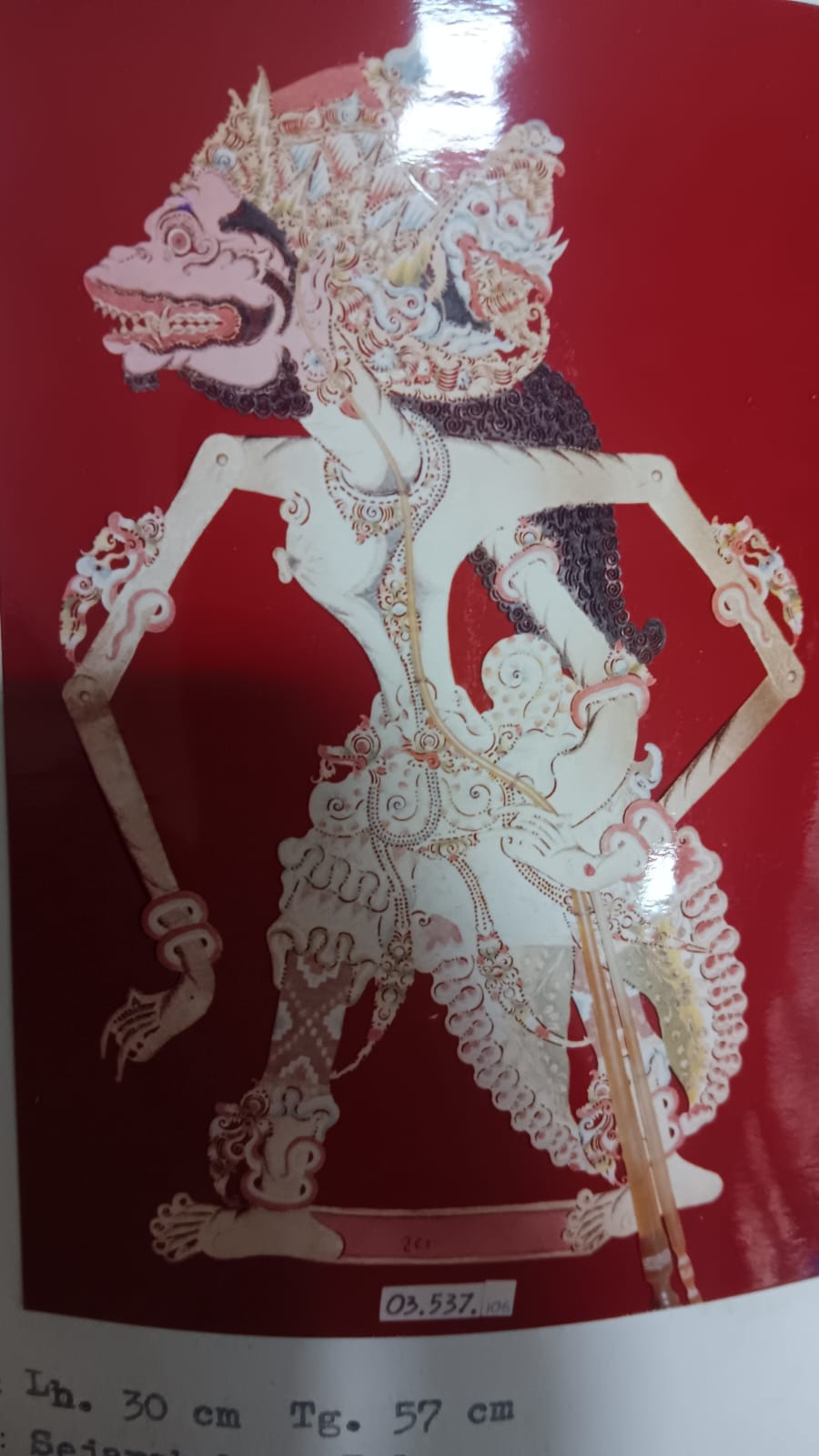 Benda ini terbuat dari kulit penyu. Berwarna coklat,merah, putih, biru, hijau, hitam. Rambut panjang, memakai mahkota, wajah buto, memiliki simbar, ber-ekor panjang dan celana panjang.