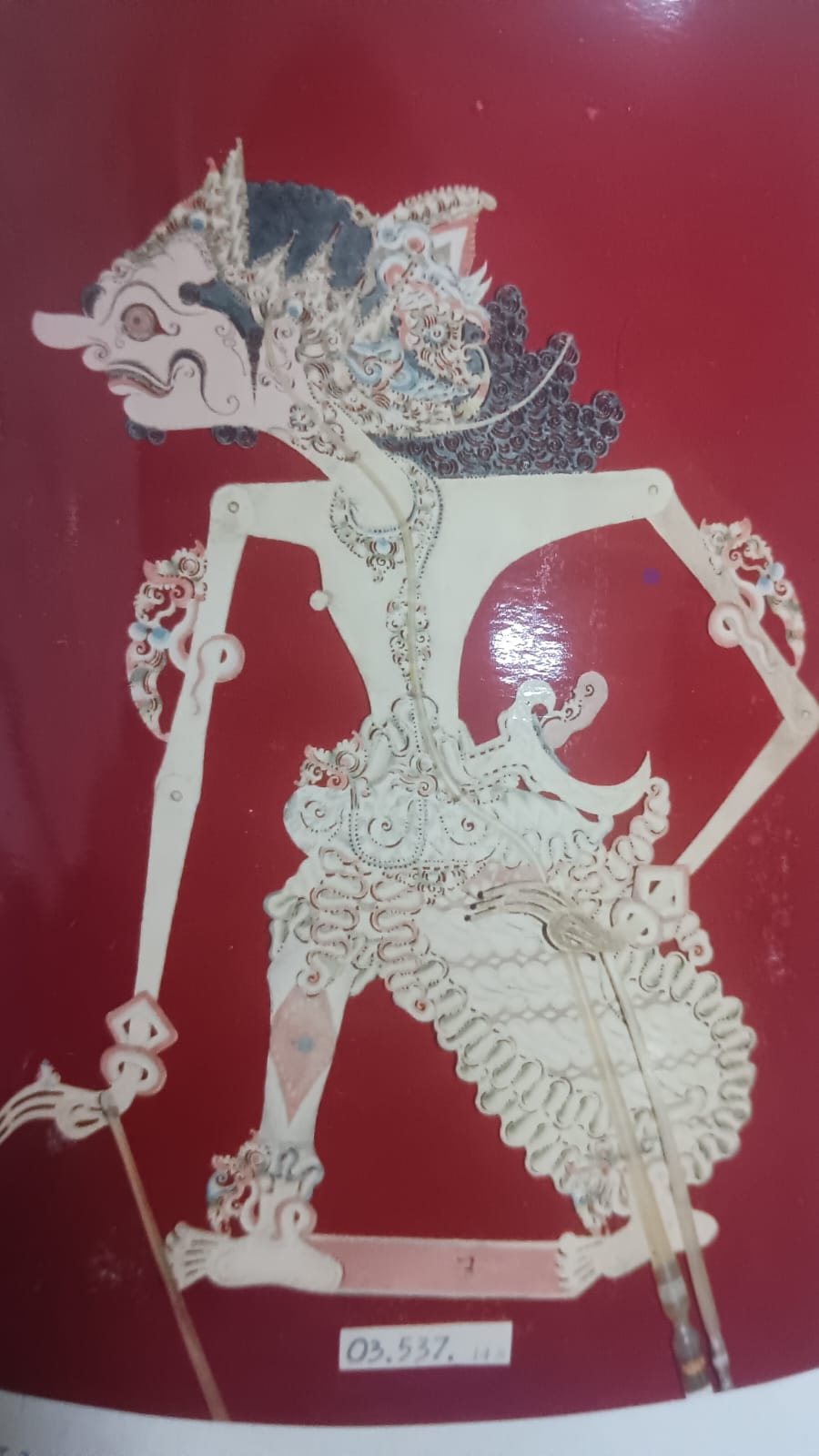 Benda ini terbuat dari bahan dasar kulit, berwarna hijau,-coklat, merah, putih. Rambut terurai, hidung besar, celana panjang. Jarik lereng, bersen-jata keris.