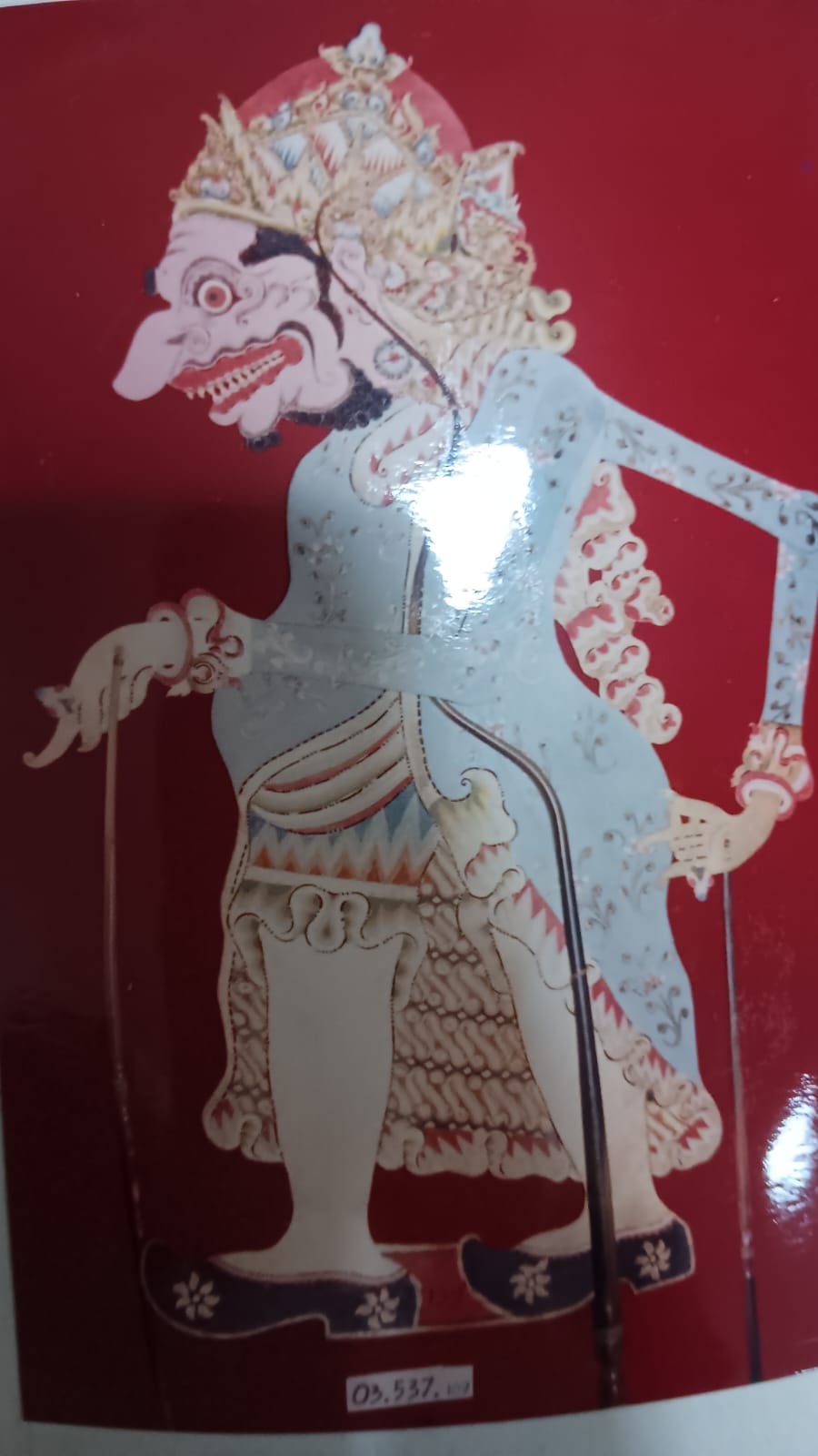 Jenda ini terbuat dari kulit penyu, berwarna coklat, biru, kuning,hijau, Rambut gelung, memakai mahkota, hidung besar, berjenggot tebal, baju seabagi, jarit lereng dan memakai sepatu,
