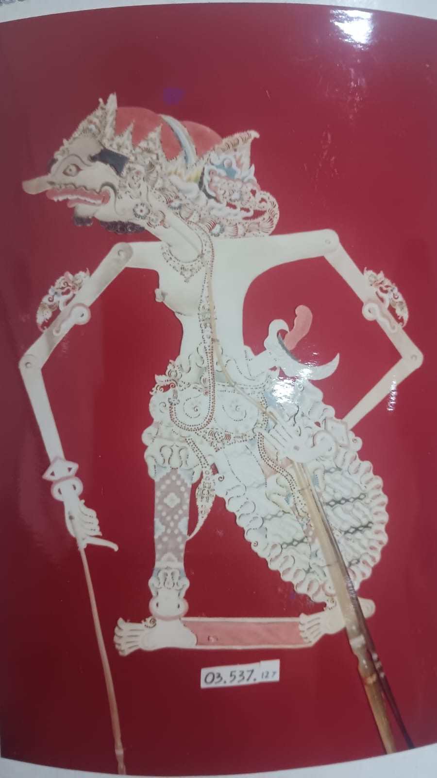 Benda ini terbuat dari bahan dasar kulit , berwarna coklat, kuning, ungu, hitam, putih, merah,.Rambut digelung memakai surban. Hidung besar,celana panjang, jarik lereng, bersenjata keris