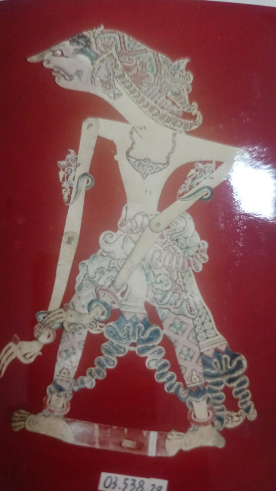 Benda ini terbuat dari kulit dan bambu, berwarna merah, biru, hijau, putih, rambut gelung, hidung mancung
