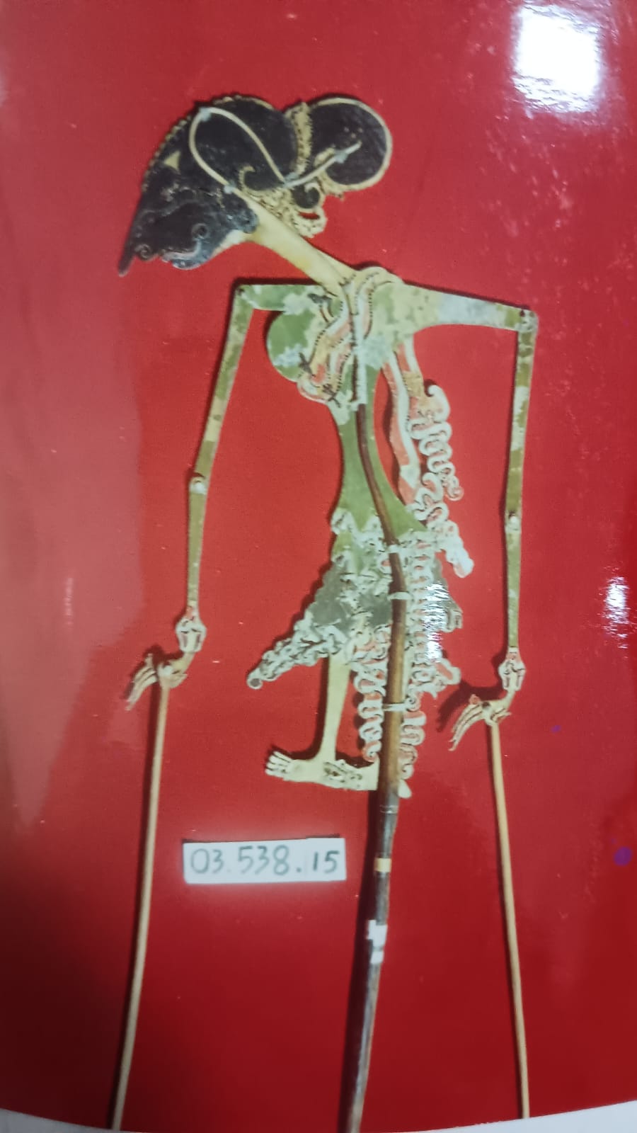 Benda ini terbuat dari kulit dan bambu, Berwarna merah, hijau, hitam, Rambut gelung ukel, hidung mancung, muka menunduk, baju panjang