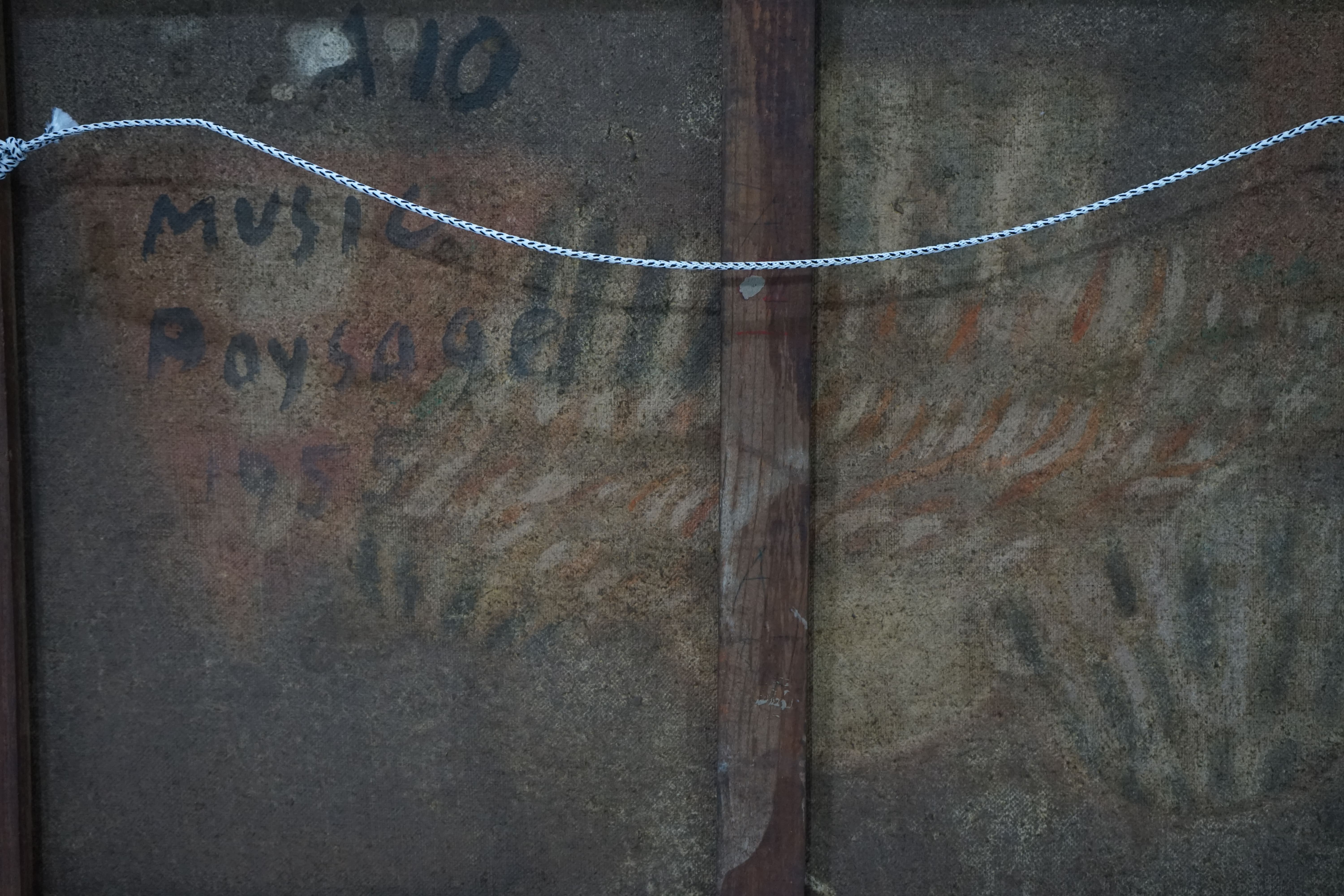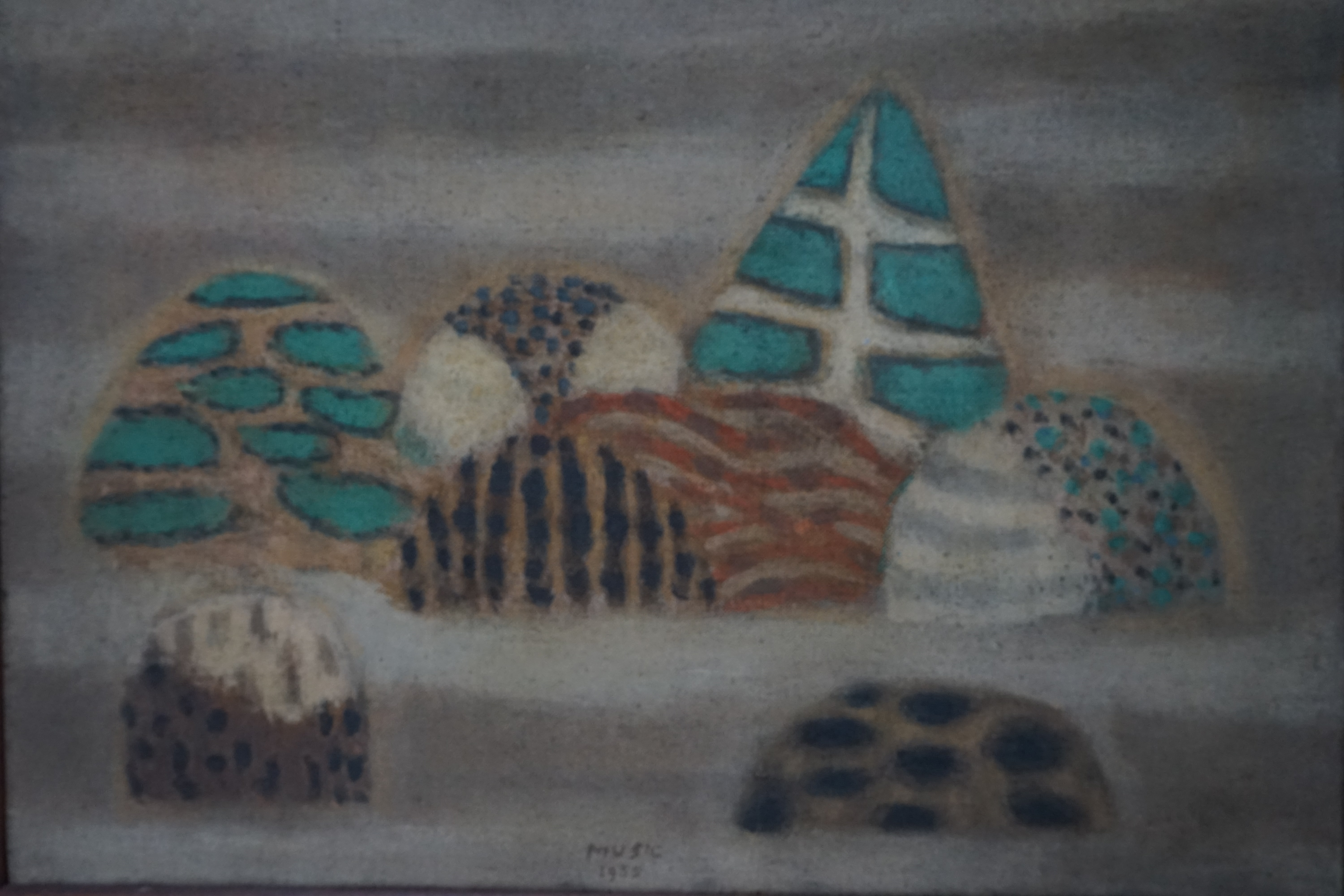 Lukisan ini membentuk lanskap abstrak dengan latar belakang berwarna cokelat muda dan garis-garis cokelat pekat yang membentang horizontal. Lukisan ini terdiri dari beberapa bentuk yang menyerupai kue kering. Bentuk pertama terlihat tinggi dan runcing berwarna biru kehijauan yang menimpa warna putih dengan garis tepi gelap. Bentuk tersebut berada di tengah gambar, di antara dua bentuk berwarna cokelat. Di belakang, terdapat bentuk memanjang ke belakang berwarna cokelat dengan garis-garis putih dan hitam. Ada bentuk lain di kiri yang berwarna cokelat lembut dengan sedikit warna hijau kebiruan. Di bagian bawah lukisan, terdapat dua bentuk setengah lingkaran berwarna cokelat, satu ditimpa warna putih, dan yang lainnya memiliki totol-totol hitam. Di tengah bawah lukisan terdapat tanda seniman dengan tulisan "Music 1955".